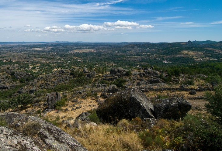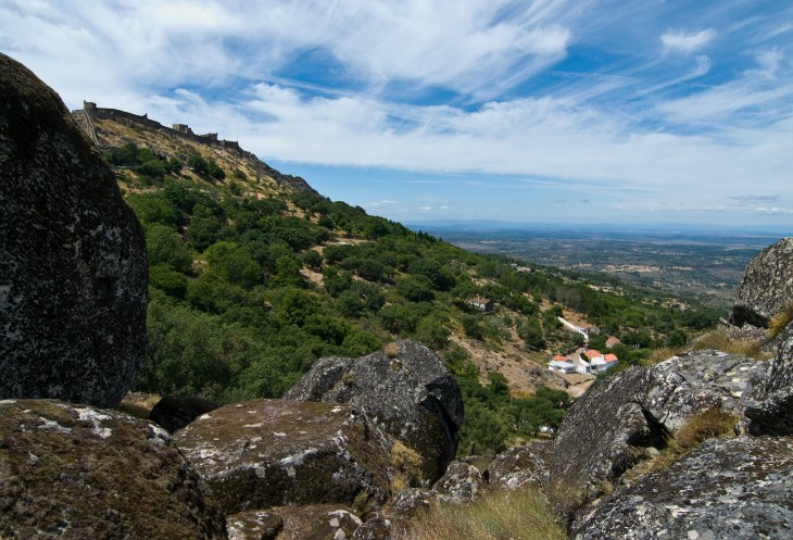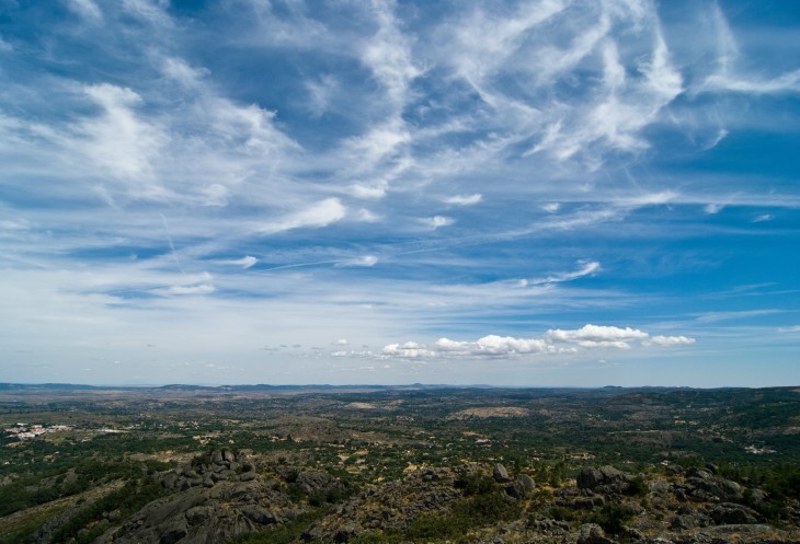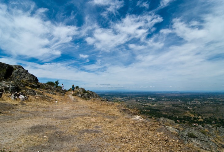 Через 10 минут мы уже наверху, но сворачиваем на смотровую площадку немного не доезжая до основной парковки. Высота около 1000 м, надо же посмотреть на красоту. Виды действительно открываются сумасшедшие. За счет своего уникального, созданного природой, расположения Марвао был идеальным пунктом наблюдения. Отсюда виден имевший важное стратегическое значение Алькантарский Мост, и все плато вплоть до горной цепи Сьерра-де-Эштрела, самой высокой в континентальной части страны. Но самое красивое, что там есть - это небо Марвао. Ты просто оказываешься в нем!