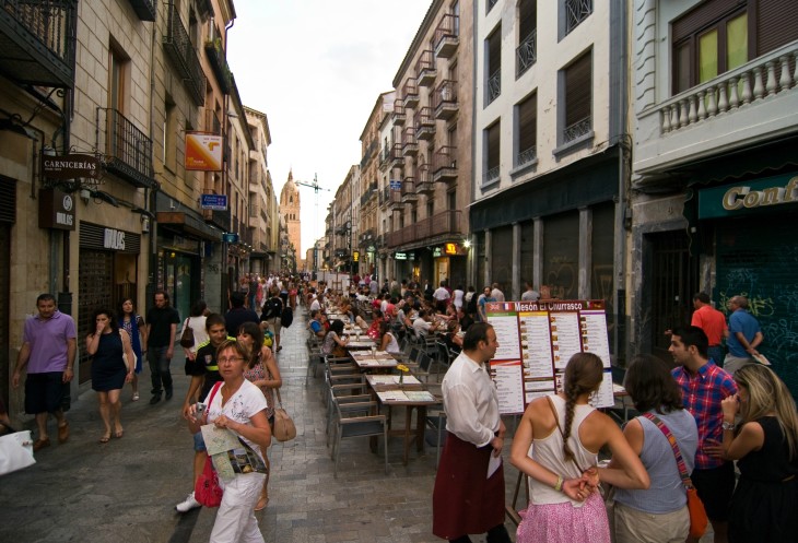 Далее по Rue Mayor держим путь к Новому Собору, кафедральному собору Саламанки, построенному в XVI веке (есть еще старый кафедральный собор XII века). Rue Mayor - это улица-забегаловка. Она вся заставлена столиками. Вокруг дорогие кафе с дешевой едой.