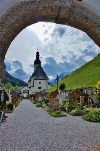 Далее мы проделали весь путь в обратном порядке до Берхтесгадена. На автобусной остановке нашли в расписании автобус до Рамзау-на-Ахе. И подумали, что другая возможность вряд ли будет, автобус едет всего минут десять. И уехали до этой деревеньки. Считается, что этот вид на церковь Св. Себастьяна с деревянным мостиком через речку-это самый популярный пейзаж Германии в любое время года. Автобус уехал дальше, а мы решили, что на обратном пути на нём же и уедем. Так всё и случилось.