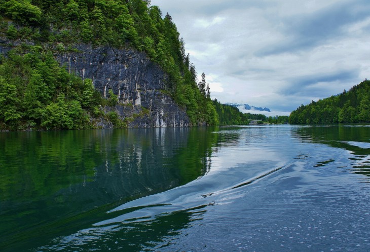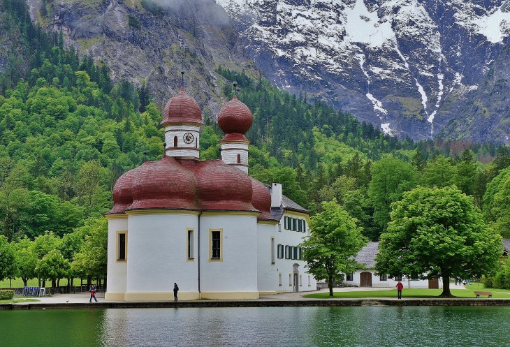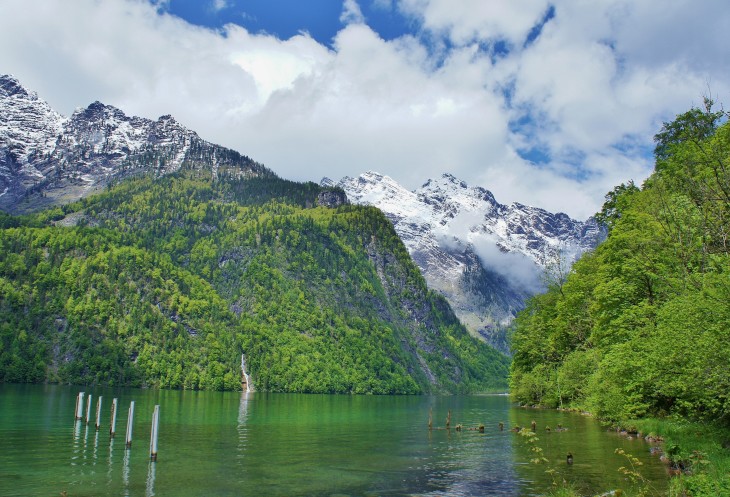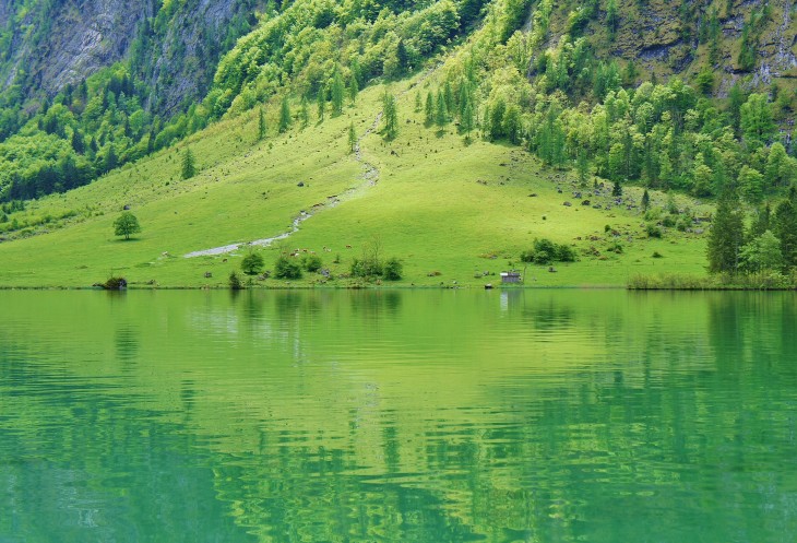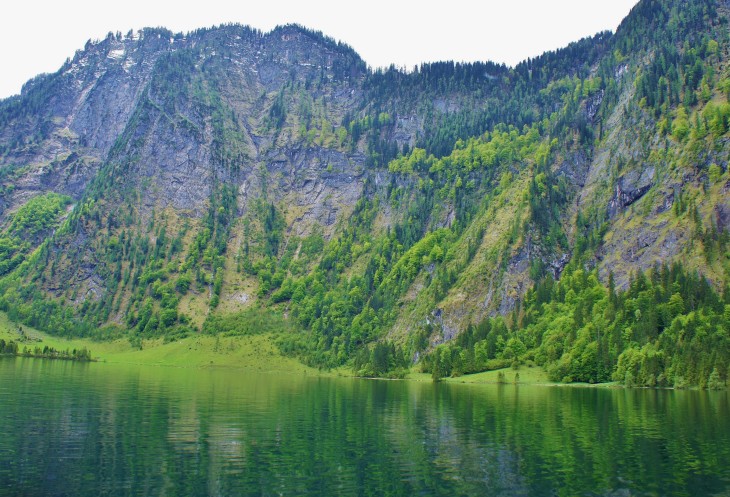 Озеро Кёнигзее ещё называют Баварским фьёрдом. Бирюзовая гладь озера отражает ещё и зелень склонов.