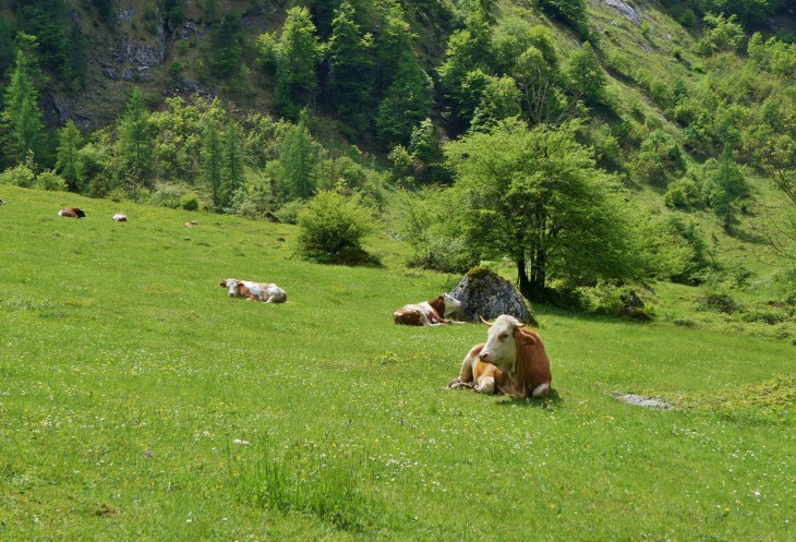 Но и это ещё не конец маршрута. Хотя дальше мы уже не пошли. В воде озера отражаются горы Хаген-Гебирге, а с высоты 400 м низвергается водопад Рётбах-Васерфаль. Примерно за один час можно дойти до противоположного берега Оберзее. Там есть ферма, можно угоститься молочком от альпийских коров.
