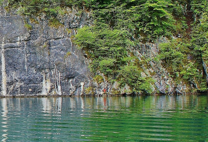 С правой стороны озера расположена горная гряда Вацманн (Watzmann). Самая высокая вершина достигает высоты 2713 м. Это вторая по высоте гора Германии. Легенда гласит, что самый высокий хребет горы Кёниг-Вацманн (Король горы). Меньшего размера хребет Кёниген (Королева горы). Остальные маленькие вершины между ними- это семь деток. Король был жестоким и коварным. Бог в наказание превратил его вместе с семьёй в груду камней. С самого озера вершину плохо видно. Зато от Берхтесгадена она видна как на ладони в хорошую погоду. На фото "детей" закрывают облака.