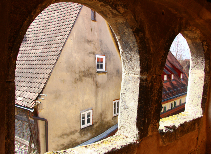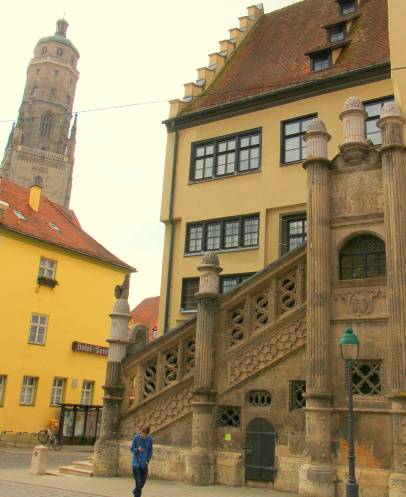 На главной площади городка, которая называется... как бы вы думали как? Ну конечно же Marktplatz! находится собор Святого Георга с башней Даниэля. Церковь, построенная в 1427-1505 гг.,подобно многим другим зданиям этого региона, сложена из суевита, взятого из Рисской чаши.