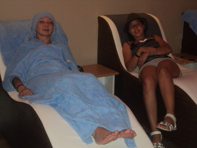 Рядом с отелем находится Спа салон энд велнесс. Точное название не помню. Цены там намного дороже, чем в так называемом хамаме в гостинице Hedef Kleopatra Golden sun. Но так уютно, такой добродушный персонал, хозяин душка. Правда понимать друг друга никак не смогли, помогали объясняться местные посетители (именно местные и гости отеля ходили в этот салон, русским там не было, кроме нас). Именно там увидела жителей с Казахстана, Узбекистана, которые стали местными. В общем мне сделали очень хорошую скидку и все спа процедуры мне обошлись в 30 долларов.