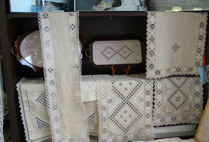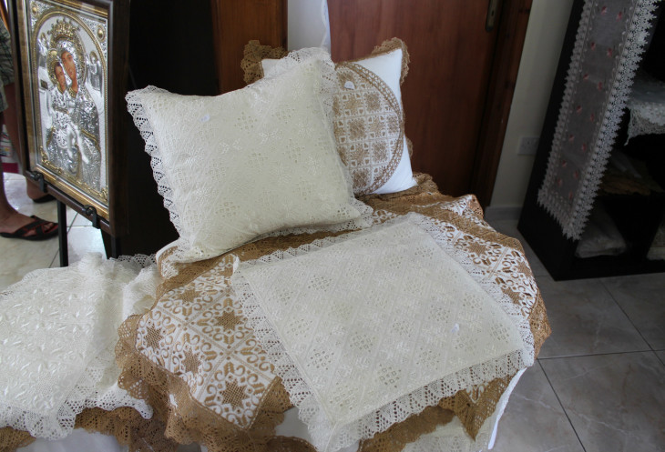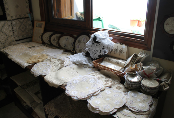 А рядом - магазин-музей, в котором можно купить знаменитое лефкарское серебро и не менее знаменитые так называемые "лефкарские кружева", лефкаритику. Кружева поставила в кавычки, потому что на самом деле по технике выполнения 90% готовых изделий - не кружево, а двухсторонняя вышивка. Такие сложнейшие узоры - и без единого узелка!! Уму непостижимо, как этого добиваются...