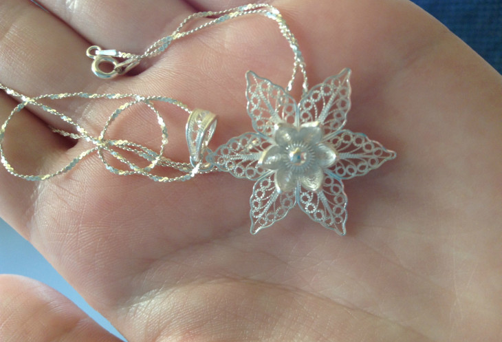 Я бродила вдоль стеллажей абсолютно завороженная, и печалилась, что карты с собой не было. А в бюджет поездки входило только украшение для дочки... Вот такую красоту мы ей купили, за 47 евро. За два года лефкарское серебро практически не потемнело!!