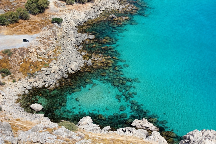 Наверх поднялись довольно легко, хотя идти по такой лестнице неудобно. Сын немного пофотографировал, в том числе и меня с колючкой, а потом облюбовал тень от единственного деревца, которое было внутри. Там он и отдыхал, пока я исследовал крепость. Обрывы вокруг крепости высокие, с одной стороны вид на красивый залив и пляж Агати, с другой – на деревню Хараки, с третьей прямо под обрывами плещется Средиземное море с не очень далекой Турцией на горизонте. В эту крепость почти никто не заглядывает, мы встретили только несколько скандинавов, которые, едва попав внутрь, с энтузиазмом принялись лазать по стенам, с риском улететь в пропасть.