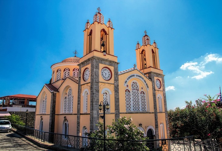 Деревня находится на склоне горы Акрамитис, в 65 км от города Родос. Церковь возведена в XIX веке, из огромных глыб, которые соединили свинцовыми скобами. В храме находятся частицы святых мощей великомученика и целителя Пантелеймона. Очень красивая, нарядная церковь, смотрится как игрушка. Особенно по сравнению с большими, строгими и серьезными российскими храмами.