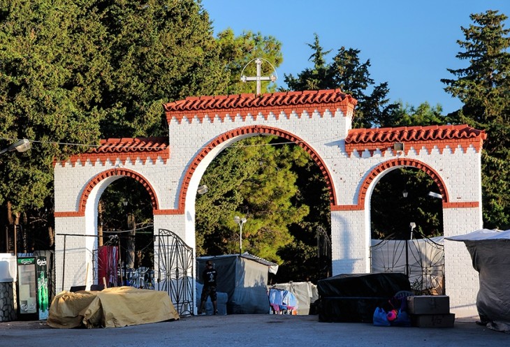 Даже в семь утра монастырь оказался довольно многолюдным. Как раз накануне там проходил праздник (престольный праздник монастыря Богородицы Цамбики, отмечается 8го сентября) с крестным ходом и выносом иконы, а затем всенощная служба. Над площадью у храма были натянуты нарядные флажки, и имелось некоторое количество мусора, который еще не успели убрать – сразу видно, народу было много. Мы немного постояли на службе (к тому времени там остались самые стойкие греки), приложились к иконе. Икона маленькая, очень старая. А заодно и узнали, как нужно правильно просить Богородицу о рождении малыша.