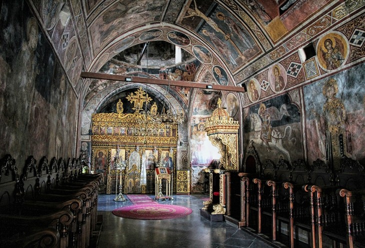Во время нашего посещения мы видели всего двух монахов – одного в лавке, второй сидел у входа в храм, и, полностью отрешившись от всего происходящего вокруг, читал книгу. В самом храме, когда мы вошли, было пусто. Тихо звучала запись службы. Тут, несмотря на запрещающие таблички, я сделал несколько снимков фресок. Редко фотографирую интерьеры действующих церквей, но в этом месте не удержался под впечатлением увиденного.