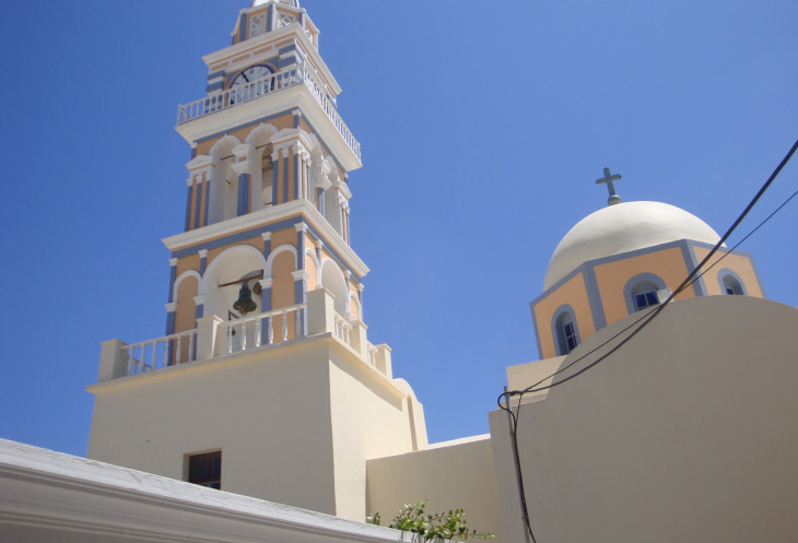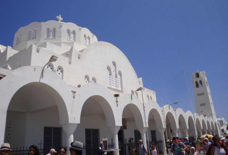 Проталкиваясь в толпе разноязычных туристов (представьте, сколько привезли два катамарана!), выскакиваем на маленькую смотровую площадку и ахаем — все-таки никакие фотографии не передают открывающуюся красоту! Хотя, конечно, тоже судорожно давим на кнопки фотоаппаратов и бежим дальше. Если бы катамаран вышел вовремя и если бы из-за шторма мы не боролись с волнами лишние полчаса, то времени бы было чуть больше. А так пробежались по «самой живописной в мире деревне», продегустировали знаменитое местное вино (мнения разделились, кто вспомнил токайское, кто Сердолик Тавриды, кто малагу, но покупать бутылку за 23 евро никому не захотелось, хоть и с добавочной бутылкой критского сухого вина ), сели в автобус и поехали в столицу острова Фиру. Там тоже времени только пробежать от православного собора до католического и вернуться в автобус.