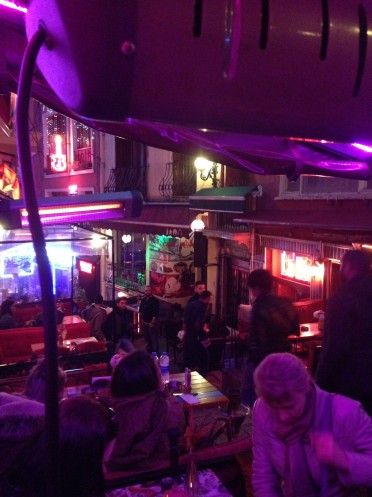 Итак идем дальше, маяк это Галатасарай лицей, от него надо уходить в боковую улицу, на повороте с правой стороны Ara cafe, известное место, кафе всемирно известного турецкого фотографа, интерьер выдает профессию хозяина, ничего сказать не могу, зашли, мест не было, пошли дальше, немного поплутав нашли во французском квартале ресторанную улочку, тоже пункт маршрута, приземлились - это даже не улочка, а лестница, на каждой ступени которой стоят столики и диваны, народ идет туда толпой, но цены просто немилосердные, самое дорогое место, в котором успели побывать, да оригинально, тусовочно, но как то не прониклись.