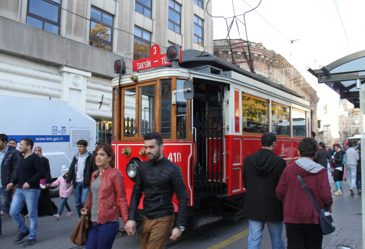 От небольшой площади перед башней веером расходятся улицы в направлении улицы Истикляль, когда то она называлась Grande rue de Pera, была центром деловой и торговой жизни со множеством банков и иностранных представительств, сейчас это самая известная пешеходно-гуляльная улица Стамбула, хотя по ней курсирует другой символ Стамбула - красный ретротрамвай,