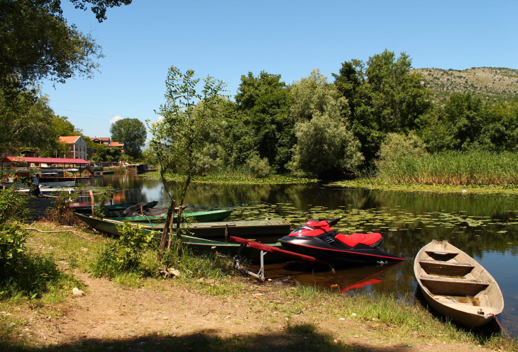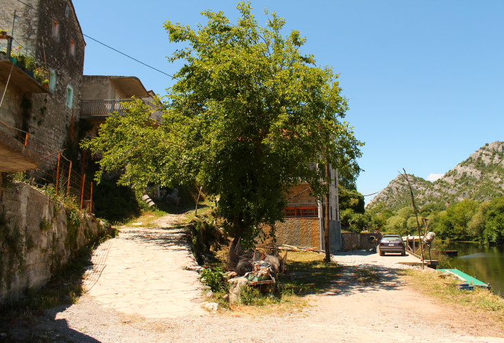 Проезжаем через мост - поворачиваем налево, и какое-то время едем вдоль Морачи по ее правому берегу. На противоположном берегу у нас остается трасса Подгорица - тоннель Созина. Минут через пять наша дорога плавно поворачивает несколько правее, и основное русло реки уже не видно. Еще минут 10 езды то ли через деревеньку, то ли через дачный поселок - и понимаешь, что уже близко... Справа появляется какая-то речка (это один из рукавов Морачи, на которые она разделяется перед впадением в Скадарское озеро), лодки... И уже совсем другие, старинные, домики у небольшой площади у реки... Все, приехали. Здесь стоянка машин, а дальше - пешочком.