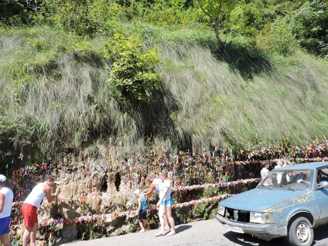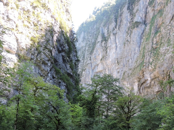 По дороге есть село Бзыбь, где сохранились остатки крепости 10 века. Въезд в национальный парк платный, но места красивые. Едешь по ущелью, вокруг горы, скалы нависают над тобой. Всюду прекрасные виды. Озеро Рицца не впечатлила. Кругом кафе. Небольшое грязное озеро. Еще хуже и намного меньше голубое озеро. Но в целом парк приятный. Машин столько, что возникают пробки. Припарковаться почти невозможно. Осмотрев все что хотел, поехал в село Лыхны.