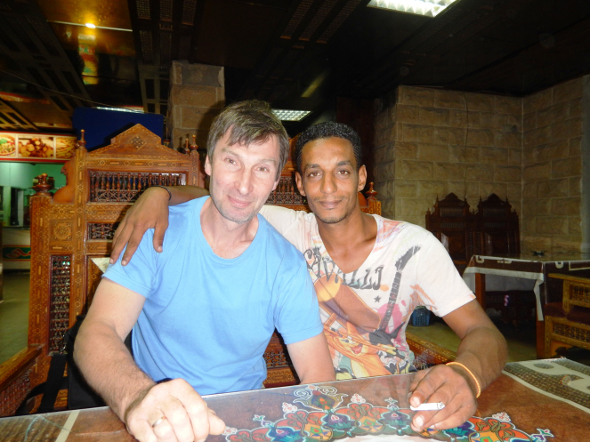 Мы еще не раз приходили в это кафе обедать и ужинать. И всегда нам были рады. Стоимость самого дорогого обеда составила 53 фунта. С хозяином кафе, добрым арабским хлопцем Уэем, после трапезы у нас случались уроки арабско-русского. Мы тыкали пальцами в предметы, я называла их по русски, он по арабски, и оба тщательно записывали в блокнотики. Многое из этих уроков мне потом пригодилось, когда надо было торговаться.