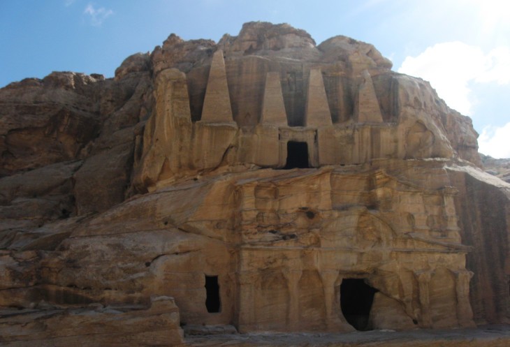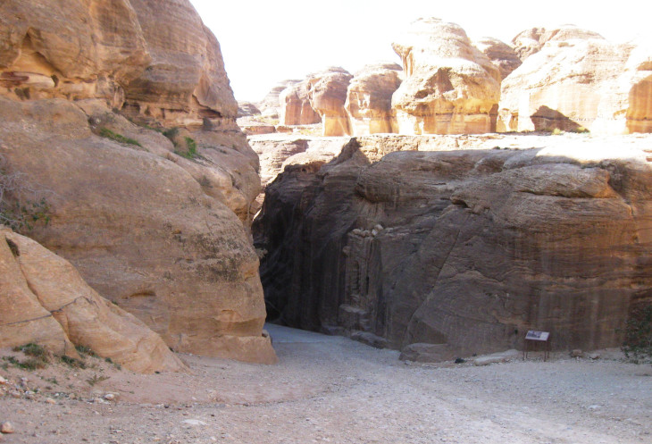 На восточной стороне Вади эль-Араба (вади - это долина или высохшее русло реки, где вода появляется несколько раз в году), у городка Вади-Муса (долина Моисея), за ущельем Сик и расположился этот таинственный город. Чтобы попасть к основным его памятникам сначала придется преодолеть ущелье Сик. Скальные склепы окружают путешественника, который держит путь к ущелью. Некоторые из них похожи на большие черепа с пустыми глазницами, некоторые теряются в скалах, а некоторые поражают изяществом отделки. Мы идем по дороге между скалами, которые становятся все выше и выше.