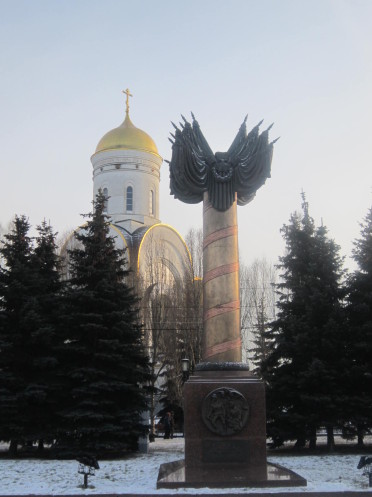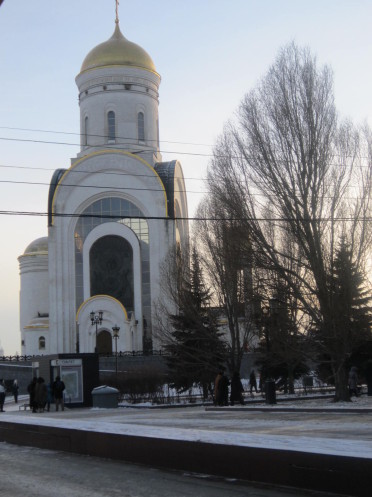 Подкрепившись Снегурочкиными пирожками в кафе Усадьбы мы поехали на Поклонную гору.Предполагают,что это название пошло от того,что люди,проходя там останавливались,чтобы поклониться церквям Москвы,которые было видно как на ладони.В 1812 году Наполеон ждал здесь депутацию бояр с ключами от Кремля,но так и не дождался.