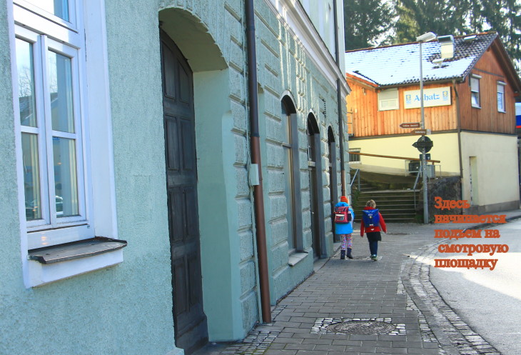 Отправляясь в Вассербург надо учесть, что вокзал находится за границей города и до него надо будет добираться на автобусе около 15 минут. Но еще раз отдаю дань уважения немецкому транспорту- расписание у них заточено под Мюнхенские поезда. Автобус ждать почти не пришлось. Удобно разместившись в полупустом автобусе, я отправилась навстречу приключениям, а они не заставили себя ждать! Еще в Мюнхене я натолкнулась на схему движения автобусов в этом крошечном городке и прикинула, где мне нужно будет выйти. Но это на карте все ровно, просто и понятно. А когда я въехала в город, то поняла, что с остановкой я могу и промахнуться. Так и вышло. Дело в том, что я решила начать осмотр города со смотровой площадки, потом спуститься вниз, пройти по мосту в город и двигаться по городу в сторону автостанции, которая находится на въезде в город. Так вот, та остановка, на которой я хотела выйти, на карте расположена совсем недалеко от смотровой площадки. Но в действительности автобус увозил меня все дальше и дальше от нее, петляя по склонам нависшей над Инном горы. На конечной остановке я подошла к водителю и как могла пыталась выяснить, можно ли пройти отсюда к смотровой площадке пешком. Видимо он меня все-таки понял, потому, что показал остановку, на которой мне надо будет выйти. Автобус тут же развернулся и мы поехали в обратный путь. Если вы поедете когда-нибудь в Вассербург- выходите на остановке сразу после Красного моста(он там один). И напротив моста увидите ступеньки- это и есть тропинка к смотровой площадке. Я их случайно обнаружила.