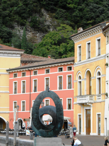 С центральной площади открывается прекрасный вид на озеро Гарда и памятник в форме корабельного носа с якорем.