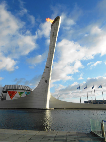 Солнце нам благоволило и светило вовсю, а высаженные пальмы у въезда на территорию олимпийского парка свидетельствовали о южном климате.