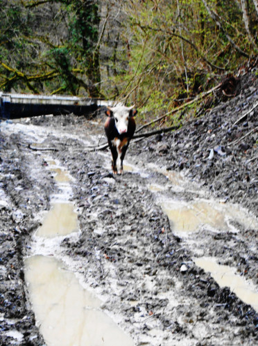 Наша палатка и вещи насквозь промокли, ночевать в ней еще одну ночь не представлялось возможным. Егерь нам рассказал, что в 3х часах ходьбы от нас располагался дом-приют для туристов. Мы решили дойти до него и остановиться там. Дорога вся была разбита, размыта и в грязи. На нашем пути случайным и единственным попутчиком оказалась корова.