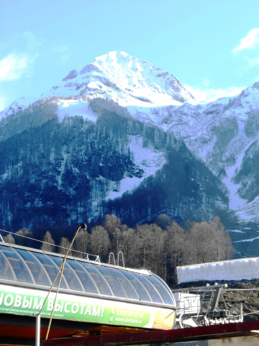 Горнолыжный курорт «Роза Хутор» встретил нас заснеженными каменными гигантами и облачной погодой.