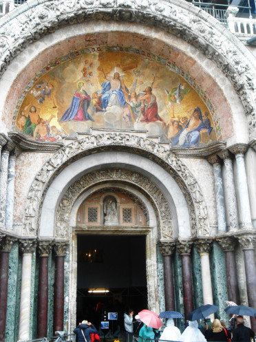 Поскольку в Маргере особо смотреть не на что (спальный тихий городок), то мы отправились осматривать островную часть. В 600 метрах от кемпинга находится автобусная остановка, откуда можно добраться до железнодорожного вокзала Венеции Санта-Лючия. По приезде в ж/д вокзал нас ожидал мелкий дождик. Он особо не мешал, но поскольку мы планировали гулять длительное время на открытом воздухе, то приобрели себе зонтов (я с изображением гондолы на Гранд-канале) в ближайшем сувенирном рынке.