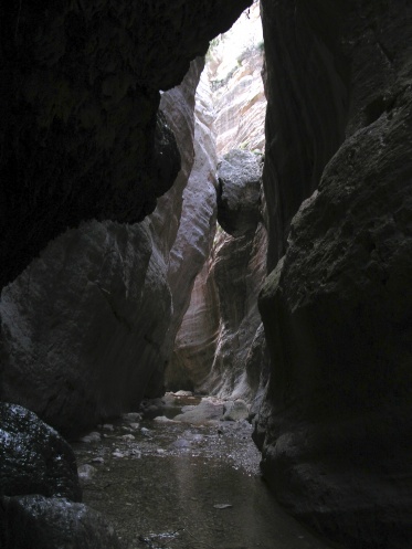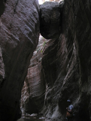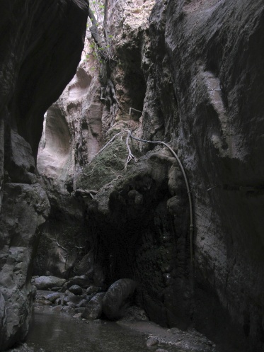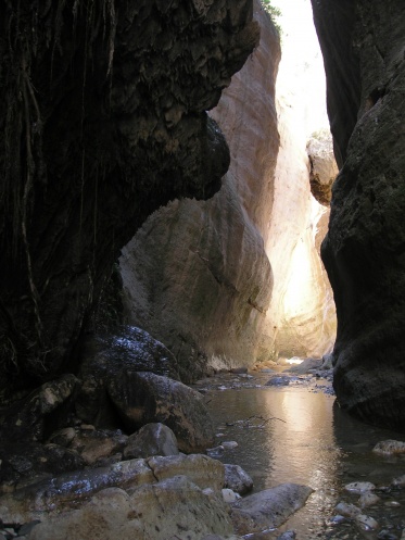 Ну, теперь лирика. В путеводителях я этого ущелья не видела, зато увидела в интернете фотки и загорелась. Так что в первый же день аренды машины поехали из Пафоса в это ущелье. Выехали утром, но по дороге заезжали в пару мест, в итоге в само ущелье начали забираться во втором часу дня, что на самом деле поздно. Туда мы с остановками прошагали 3 часа с хвостиком, а обратно — полтора часа, когда солнце уже начало клониться к закату. Узкие участки ущелья на обратном пути были совсем мрачными и даже страшноватыми. Рекомендую всем сначала осматривать это ущелье, а потом уже на обратном пути заезжать в другие места, коих много по пути. Если ехать из Пафоса, то вы будете по очередности проезжать: