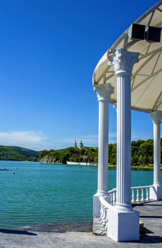 Вдоль озера причудливой формы и прекрасного бирюзового цвета протянулся ряд сооружений, среди которых выделяются белая беседка, церковь