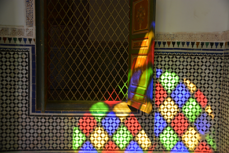 Мы заехали в дворец Бахия рано утром, и обнаружили, что витражи окошек под потолками гаремных комнат в союзе с солнечными лучами сотворили цветовое шоу с венецианским колоритом и спровоцировали очередь из посетителей-фотографов, мечтающих о кадре дня.