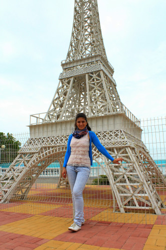 На самой набережной мы заметили точную уменьшенную копию парижской Эйфелевой башни, но выкрашенную в белый цвет.