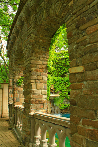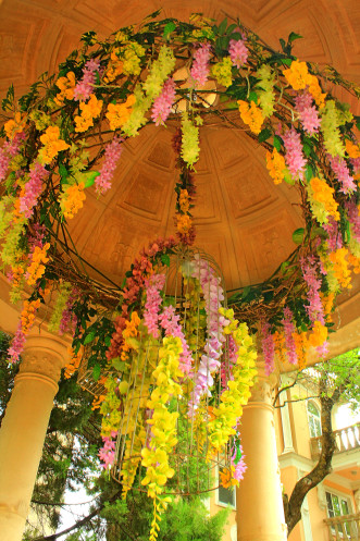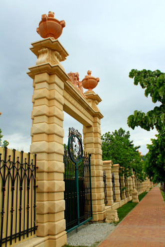 Рядом же с домом архитектора расположена беседка, под куполом которого нависают живые цветы, а колонны украшены каменными цветами.