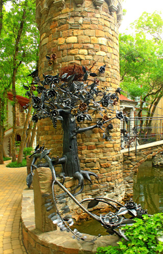Средневековье в парке представлено дозорной башней, которую с одной стороны обвивает железный дракон,