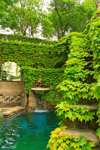 Попасть внутрь башни можно через стилизованный мост с железными перилами, перекинутый через пруд.