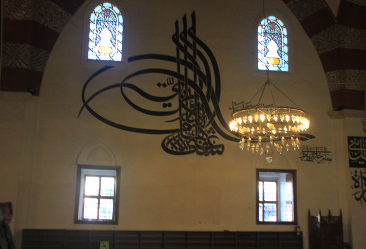 Во-первых, мечеть не имеет единого молельного зала, как я это привыкла видеть, и разделена пополам колонами. Во-вторых, никаких привычных фресок. Только отштукатуренные стены, редкие изображения орнаментов цветов, выполненных поверх штукатурки, а сверху, строгим каллиграфическим почерком выведена арабская вязь. На куполе очень мало окон, зато по стенам они идут в два ряда. Поэтому освещение тут не такое мягкое, как обычно бывает в других мечетях, а немного резковатое, т.к. свет не струится сверху в большом количестве, а бьёт из окон по периметру. Свекровь переводит для нас арабский язык. Главное имя Аллаха, потом вязь совместного имени главного пророка Ислама Мухаммеда в связке с именем Аллаха, и имена остальных пророков: от Адама до Иисуса (Исы). Фотографировать тут сложновато из-за особенности освещения, но и снимки получаются немного загадочными.