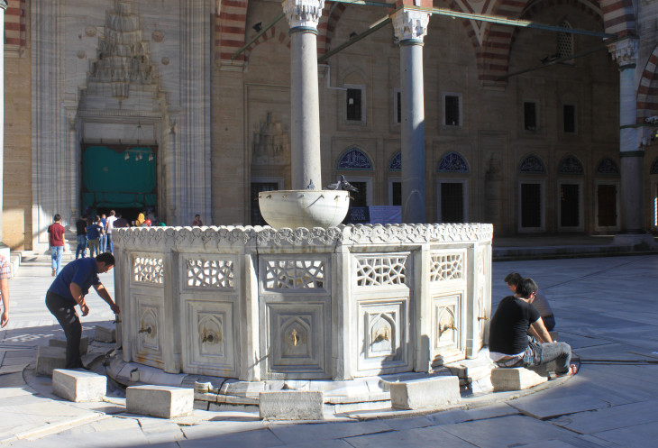 Нигде в интернете об этой особенности данной мечети я информацию не видела. Есть много постов об этом архитектурном сооружении, но такое впечатление, что все они написаны под копирку. Да, мне было интересно узнать, что минареты в Селимие ниже только минаретов Мекки. Что мечеть многогранна восемью колоннами, но квадратность не ощущается, за счет точно выверенной постройки и визуально «округления» за счет колонн и купола внутри. После увиденного я поняла, почему Мимар Синан (о, мой кумир - Архитектор!!) считал Селимание своим лучшим творением. Только с некоторых ракурсов можно увидеть целиком три минарета. А вот сразу четыре полностью увидеть практически нереально. Если, ради любопытства, вы обратитесь к поисковикам интернета, то по запросу картинок мечети он вам выдаст ее панорамные виды СВЕРХУ. Вот тогда все четыре мечети видны целиком. В общем, у нас был «взрыв мозга», мы ходили вокруг мечети и считали минареты, пока наша мама совершала намаз внутри Дома Аллаха. Мы тоже побывали и внутри мечети, и во внутреннем дворике комплекса. Чешме для совершения омовения перед молитвой во дворике вообще меня разочаровал: показался каким-то незавершенным.