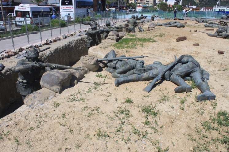 Эрсан нас поторапливает. Ехать до Эдирне еще далеко. А у нас запланирована ещё одна остановка по маршруту. Лейла ещё раньше, когда не думала, что мы её позовём с собой, рекомендовала одно местечко по маршруту, где есть совершенно потрясающий памятник, посвященный бойцам этой войны. К сожалению, название городка выпало из моей памяти, но проехать мимо него невозможно. Я подозреваю, что это как раз в самом Гелиболу, т.к. сразу после него мы ушли от побережья пролива. Муж название города тоже не сказал, пожал плечами, отослал в интернет. Но о Гелиболу в интернете при запросе о местных достопримечательностях я нашла упоминание только о памятнике, поставленном Русским обществом в 2008 году в память о Белой Армии. Неожиданно и совсем мне не по теме. В общем, я ставлю фотографии, смотрите. Невероятно реалистичное зрелище. На небольшой площади расположились с два десятка скульптур, изображающих конкретные действия людей, находящихся на поле сражения. Жутко, настолько правдоподобно.