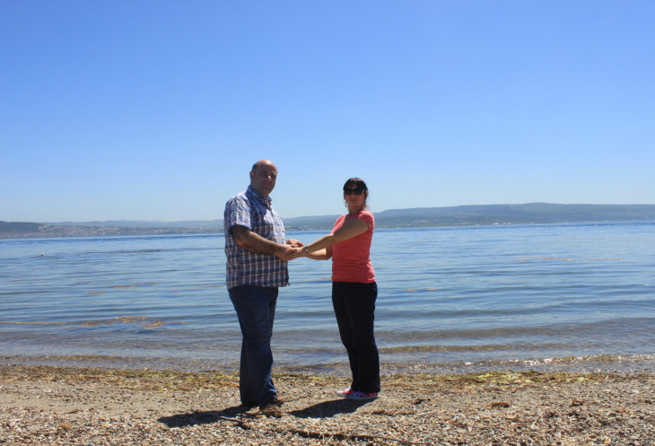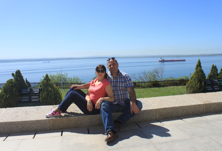 Прошу Лейлу сфотографировать меня с любимым супругом на фоне пролива.