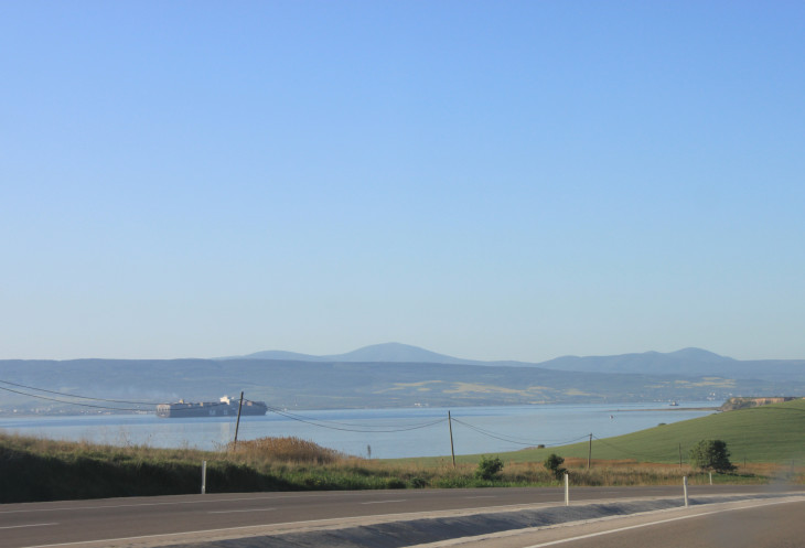 Дорога хорошо асфальтирована. Сначала неожиданно выныривает из низины между холмами, а потом открывает нам по правому борту свои великолепные обзоры «какое-то море».
