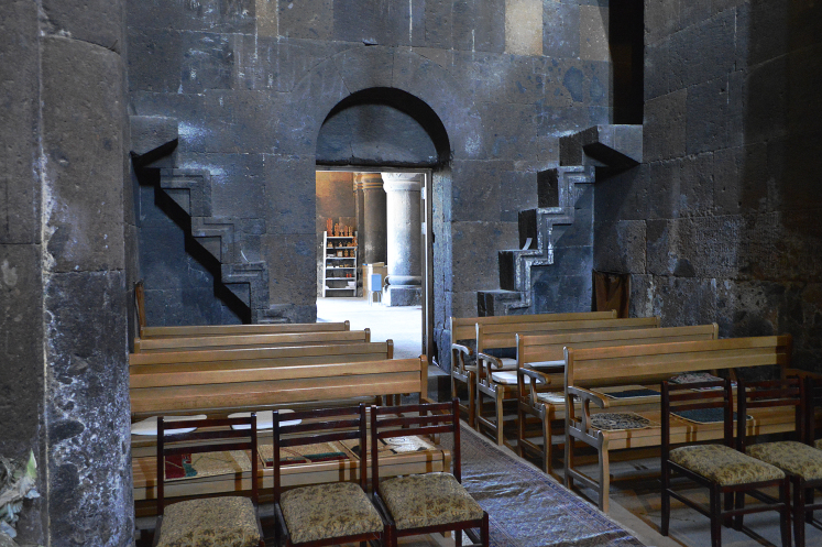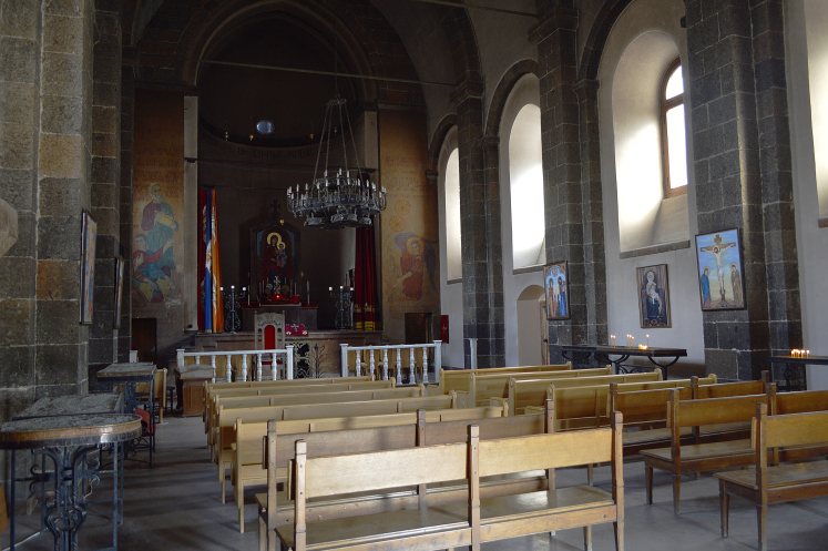 Внутреннее пространство церкви оформлено традиционно просто, и, как и в подавляющем большинстве церквей, здесь царит полумрак.