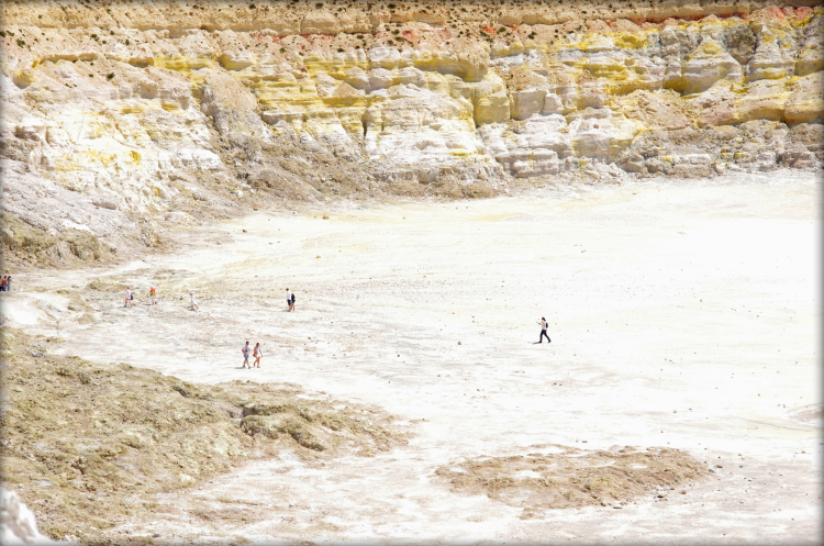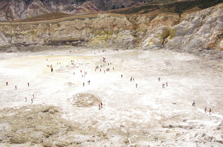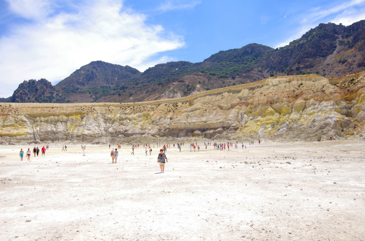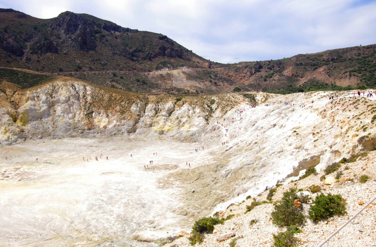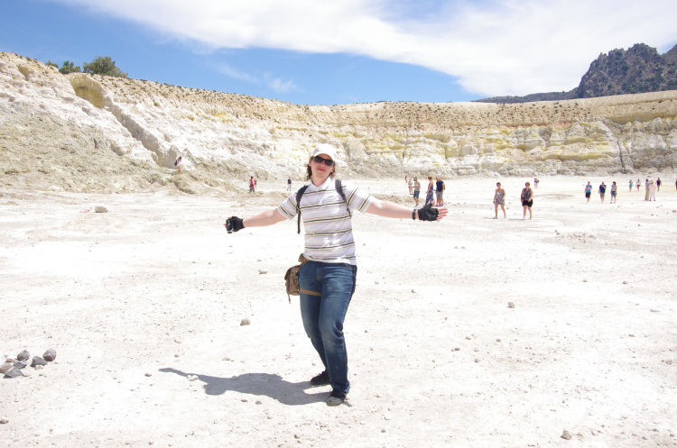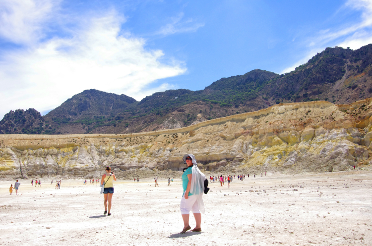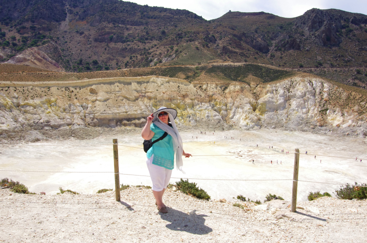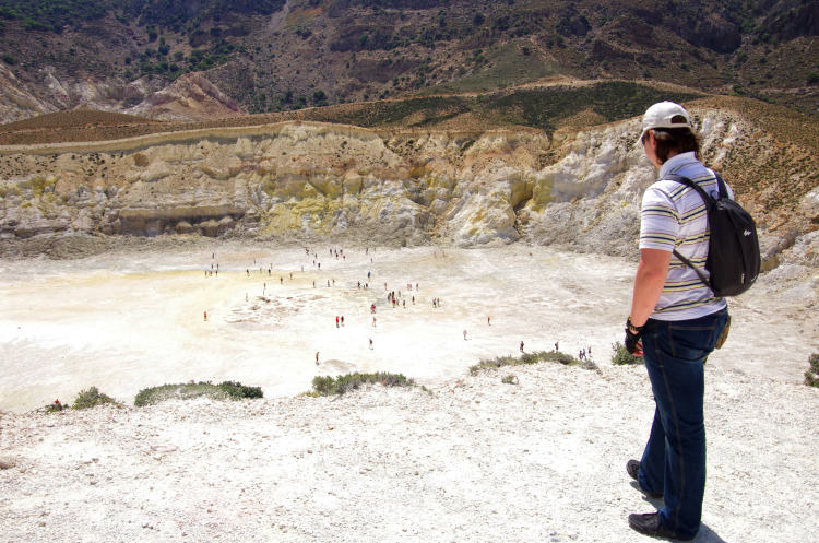 Итак, по серпантину наверх, потом вниз, мы очутились в кальдере. Она уже поросла деревьями, так как последнее извержение было 7 веков назад, а последняя активность всего 15 лет. Вулкан до сих пор активен – как и на островах Милос, Санторини и Метана. Но он мирно спал посапывая, весь окутанный датчиками ученых, следящих за его состоянием.