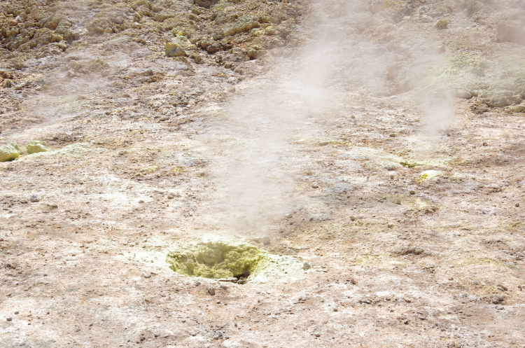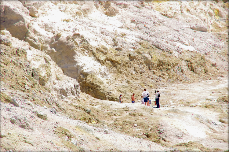 Здесь я почувствовала холодок, пробежавший по спине, когда меня остановил сын, что бы я с размаху не наступила в ничем не примечательную лунку. Я нагнулась к ней и услыхала шипенье, шкварчанье и бульканье. О-о-о-о, впечатление было сильное. Можно сказать, я была потрясена от ощущения, что это что-то шкварчащее так близко и может вырваться в любую минуту на волю. Я уже не хотела находиться здесь внизу, но все таки сделав усилие над собой, прошла в дальний конец кратера, где вырывались струи пара из под земли.