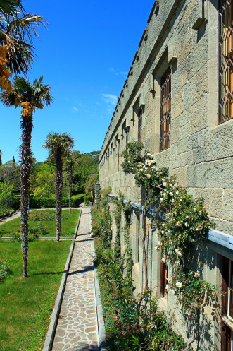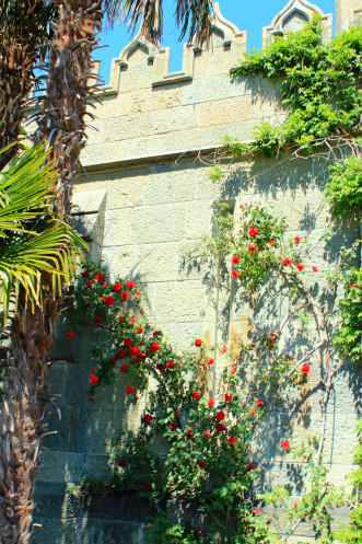 Выполненная в серых тонах замковая архитектура ничуть не вызывает ассоциации с мрачным средневековьем. Дворец смотрится нарядно, особенно в окружении пальм, роз и величественных гор.