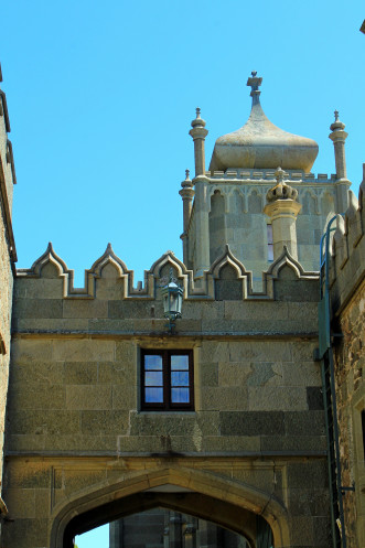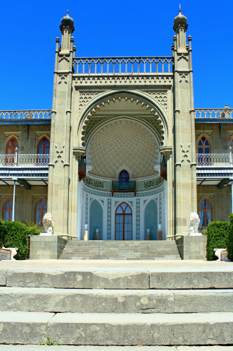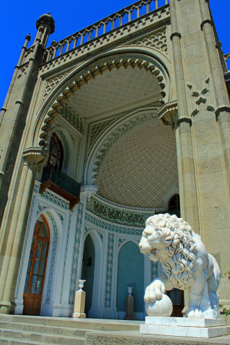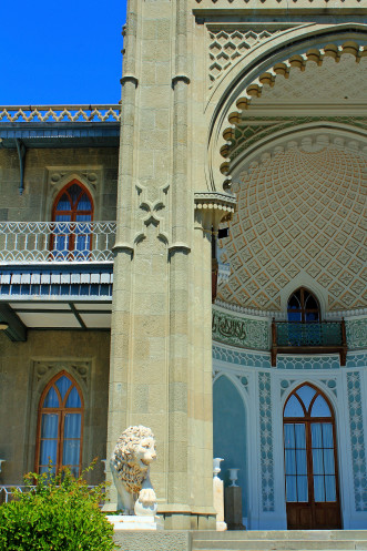 Не могли мы также обойти стороной южный фасад здания и великолепной Альгамбры со львами, оригинал которого находится в Гренаде, Испания и взят за образец графом для своего дворца.