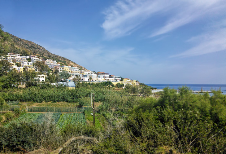 Далее получаем без задержек багаж, встреча от Музенидиса (туроператор) - и вот мы уже в автобусе, едем на запад. Красота вокруг! Нетерпение заставляет запустить навигатор и наблюдать, как и с какой скоростью мы приближаемся к нашей гостинице. Ну и, конечно, трудно удержаться, чтобы не сфотографировать что-нибудь прямо из автобуса на планшет.