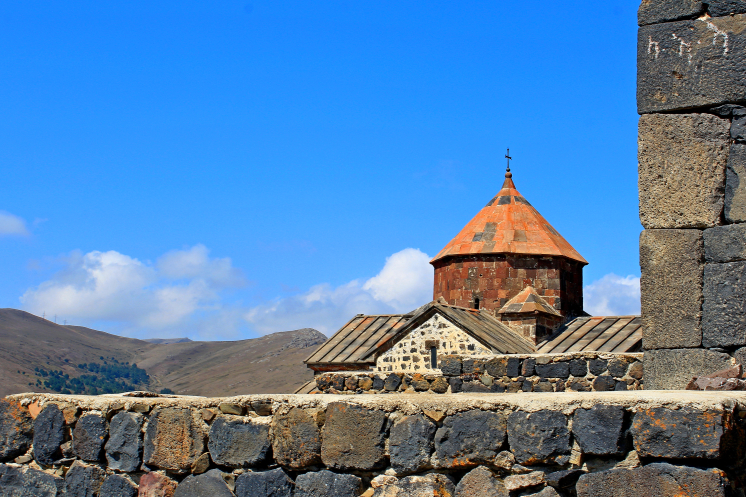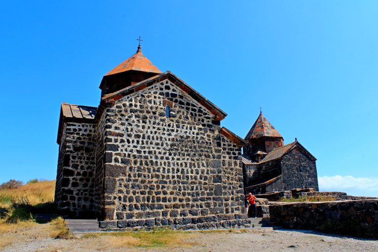 Первым делом мы решили подняться к холму, на вершине которого стоит церковь Севанаванк. Взяв по мороженному, мы поднялись к храму, который ранее располагался на отдельном острове посреди озера. По цвету стен из вулканического туфа берет название сама церковь (от арм. сев — «чёрный» и ванк — «монастырь»).