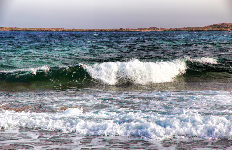 Пробравшись по узким дорожкам мимо рощ и таверн выезжаем на песок. Вот это день! Перед нами еще один потрясающий пляж, и он отличается от Элафониси и Кедродассоса. Длинная и широкая полоса песка уходит направо и налево, сколько хватает глаз. Сзади нас горы, над которыми невесомо парят парапланеристы. Дует легкий, приятный ветерок. А впереди бескрайнее, искрящееся море, над которым весело сияет солнце. Островок справа... Какой простор, просто дух захватывает. И волны! Вот это - забава для нас :)