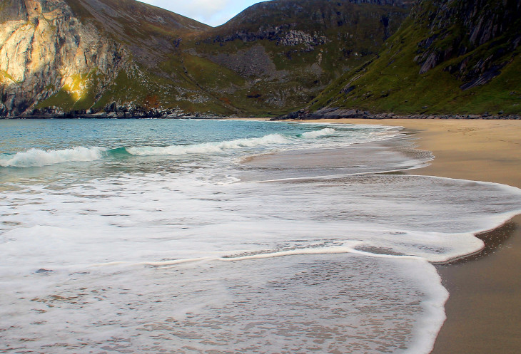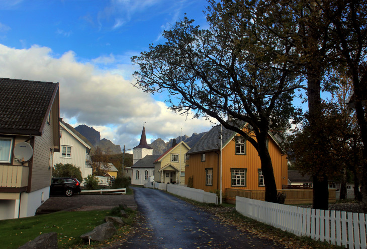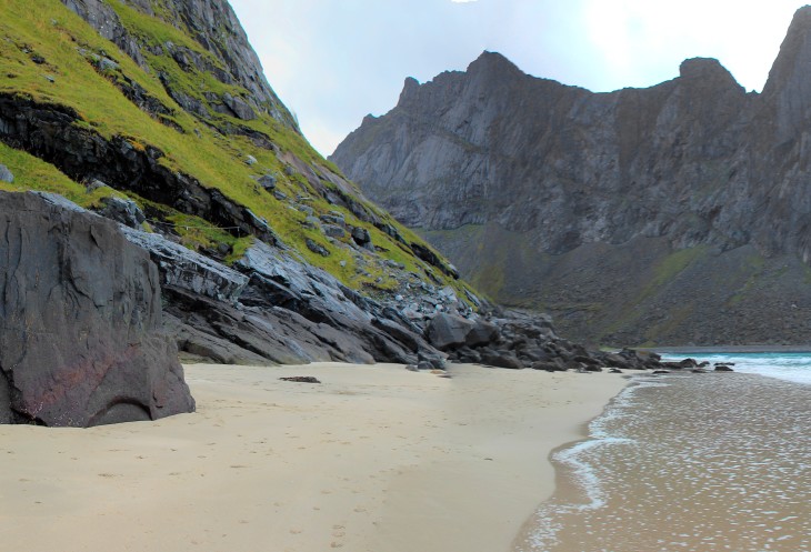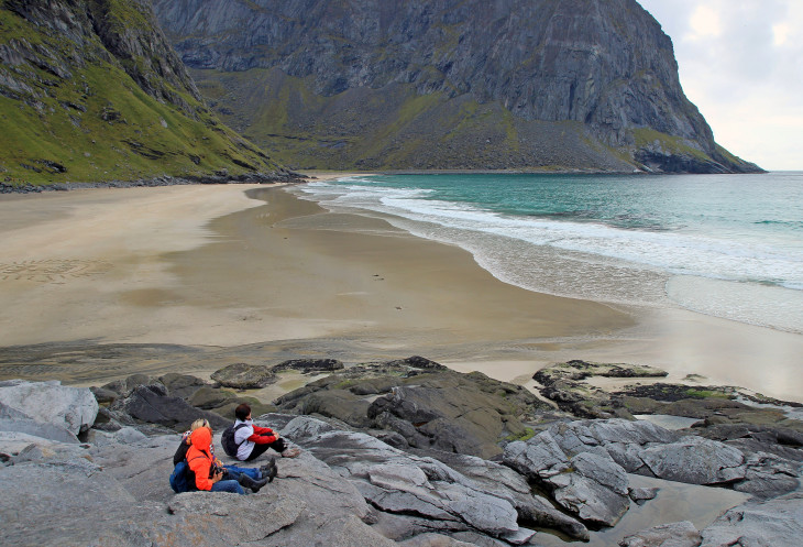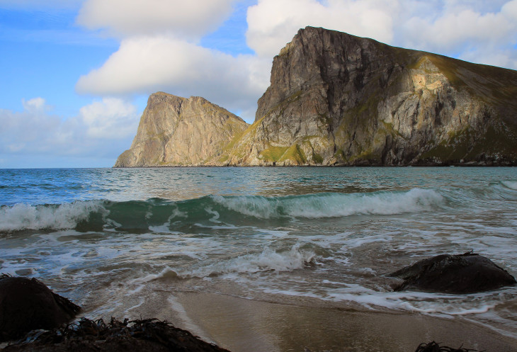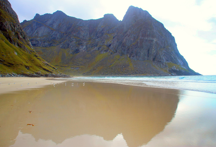 Посовещались насчет наших действий на сегодня – был выбор: либо поднимаемся на гору Рейнебринген, либо едем на пляж Квалвик, оба этих места стояли у нас в планах. Посмотрели на гору, которая из-за своей крутизны вызывала некоторый страх, и решили, что лезть на нее сразу после дождя не очень хорошая мысль. Значит, сейчас поедем, пообедаем, а после этого отправимся на пляж. Там и идти недалеко, около 2 км и перепад высот невелик, около 200 метров не крутого (это мы тогда так думали!) подъема.