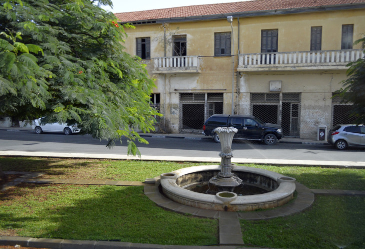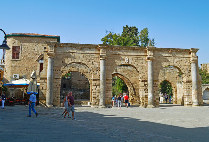 Выходим на площадь и идем через нее к развалинам Дворца Венецианского губернатора. От роскошного дворца остался только трехарочный вход с античными колоннами,привезенными с раскопок древнего Саламиса.